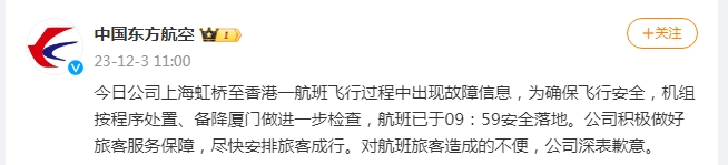 中新網(wǎng)12月3日電 據(jù)中國東方航空官方微博消息,3日該司上海虹橋至香港一航班飛行過程中出現(xiàn)故障信息,為確保飛行安全,機組按程序處置、備降廈門做進一步檢查,航班已于09:59安全落地。