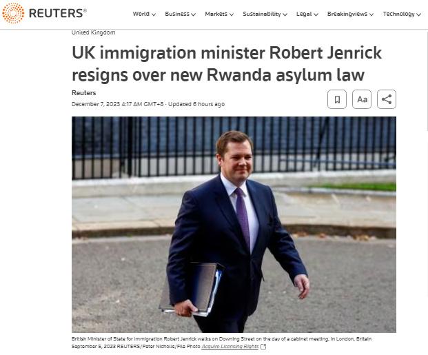 報(bào)道稱(chēng),詹里克對(duì)英國(guó)政府當(dāng)日公布的“盧旺達(dá)安全(庇護(hù)和移民)法案草案”持有不同意見(jiàn)。他在一封辭職信中表示,該立法是在2024年英國(guó)大選之前解決移民危機(jī)的“最后機(jī)會(huì)之一”。