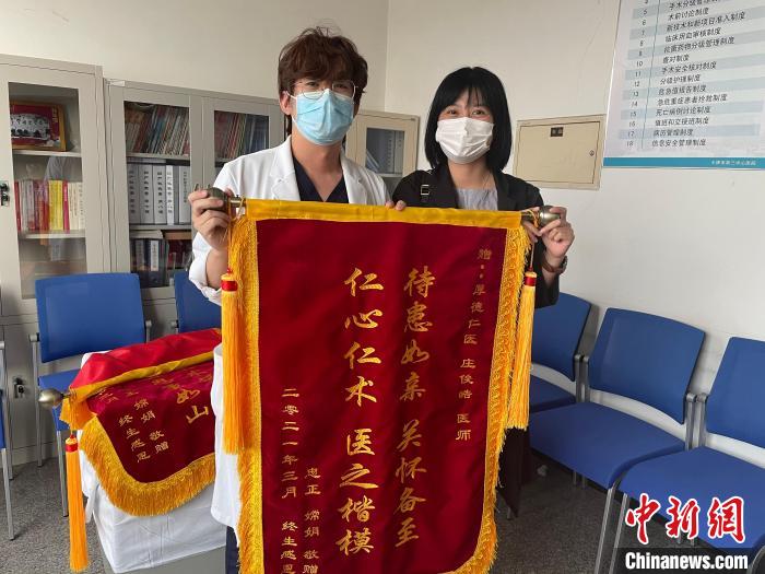 患者出院一個禮拜以后,專程帶著錦旗來致謝莊竣皓。受訪者供圖