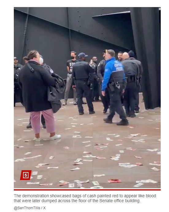 據(jù)美國《紐約郵報(bào)》報(bào)道,在抗議示威活動中,有成袋的美元鈔票被涂上紅色,看上去“血跡斑斑”,并被傾倒在大廳的地板上。