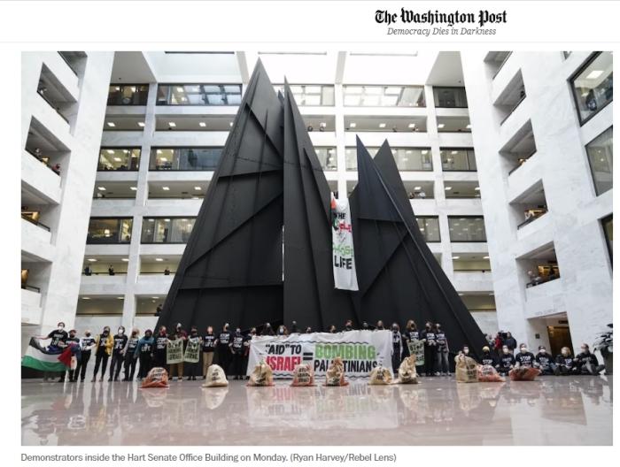 報(bào)道稱,抗議者身穿寫有“立即停止(援助)武器”字樣的黑色T恤,高喊“立即?;?!立即?;穑 薄K麄冞€舉著寫有“援助以色列=轟炸巴勒斯坦人”的條幅。