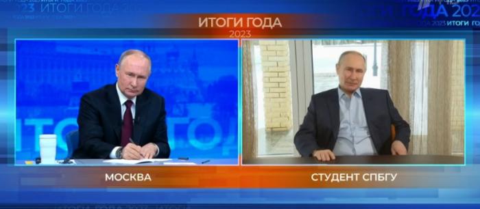 俄總統(tǒng)2023年年度記者會上,主持人播放了一段帶有普京影像和聲音的合成視頻,畫面左側(cè)為普京,右側(cè)為合成人像。圖片來源:俄羅斯第一頻道截圖