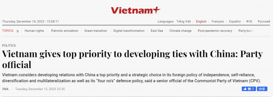 中國(guó)日?qǐng)?bào)網(wǎng)12月14日電 12月12日,中國(guó)和越南共同宣布中越兩黨兩國(guó)關(guān)系新定位,在深化中越全面戰(zhàn)略合作伙伴關(guān)系基礎(chǔ)上,攜手構(gòu)建具有戰(zhàn)略意義的中越命運(yùn)共同體。國(guó)際媒體對(duì)中越關(guān)系新定位進(jìn)行了密集報(bào)道,認(rèn)為雙邊關(guān)系更加重要,中越兩黨兩國(guó)關(guān)系邁上新臺(tái)階。