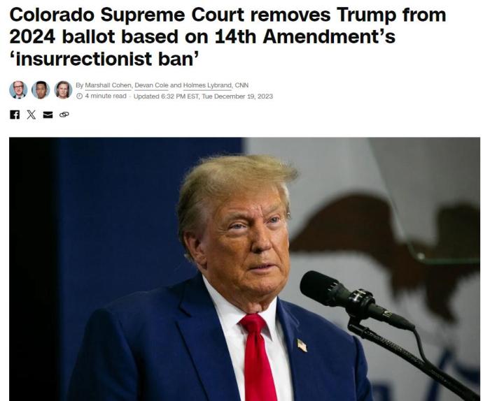 中新網(wǎng)12月20日電 綜合美媒報(bào)道,美國科羅拉多州最高法院當(dāng)?shù)貢r(shí)間19日裁定,根據(jù)美國憲法第14修正案,鑒于美國國會(huì)騷亂事件,將共和黨籍前總統(tǒng)特朗普從該州2024年總統(tǒng)初選的投票中除名,認(rèn)為他沒有資格競選美國總統(tǒng)。