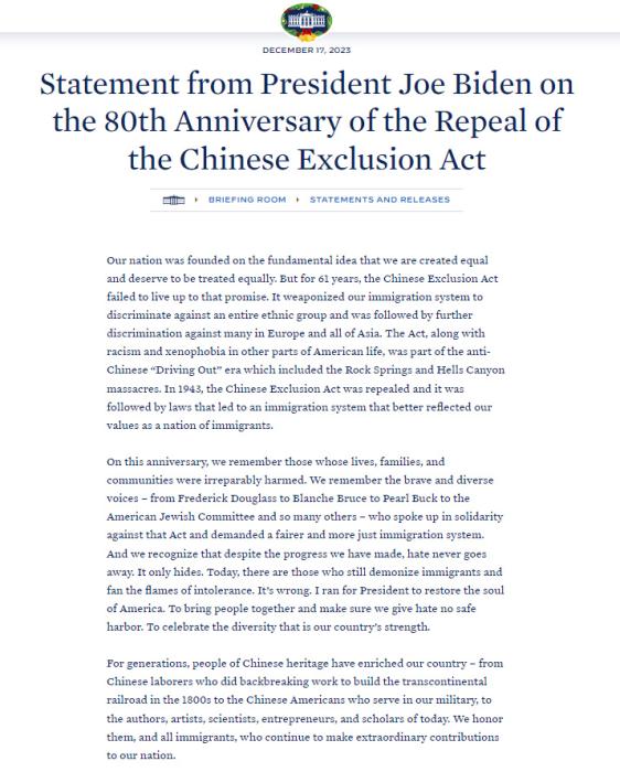 當?shù)貢r間2023年12月17日,薛海培終于等到了白宮的文告。美國總統(tǒng)拜登在文告中指出,“人人生而平等,應該受到平等對待”,但《排華法案》與這一理念背道而馳,“它將我們的移民制度武器化,歧視整個種族群體,隨后又進一步歧視歐洲和整個亞洲的許多人。”