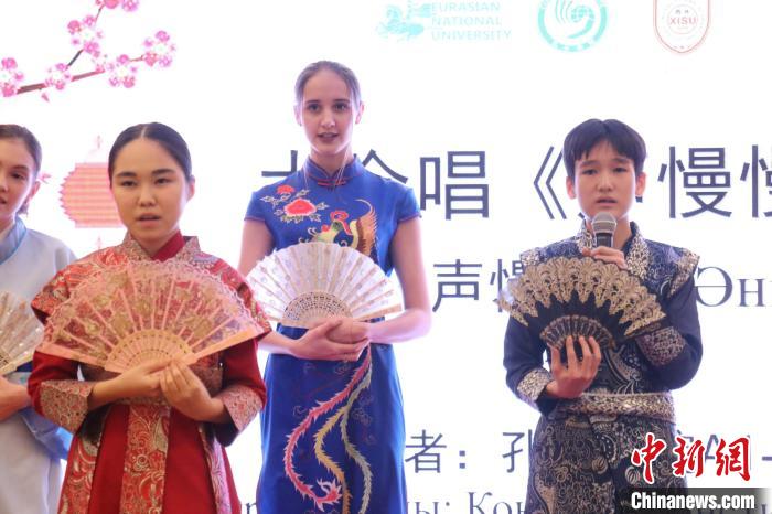 12月22日晚,哈薩克斯坦阿斯塔納,“漢語風采,中哈同歡”2024年阿斯塔納中文盛典暨元旦聯(lián)歡慶?;顒优e行。圖為身著中國傳統(tǒng)服飾的哈學生為觀眾帶來精彩表演?! ≈行戮W(wǎng)記者 張碩 攝