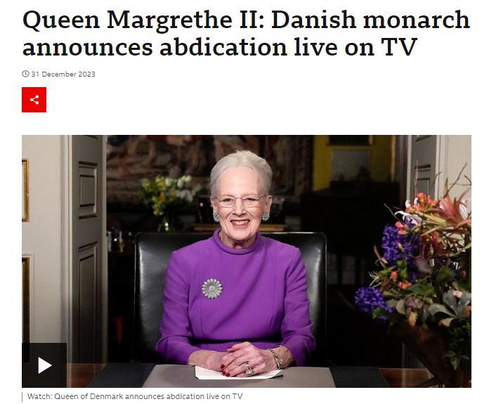 “我認(rèn)為現(xiàn)在是正確的時機(jī),”瑪格麗特二世補(bǔ)充說,并在致辭中對丹麥民眾多年的支持表示感謝。