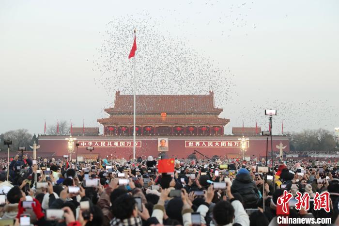 隨著國旗升至旗桿頂端,萬羽和平鴿騰空而起,繞著天安門廣場(chǎng)盤旋。在《歌唱祖國》的旋律中,“新年快樂!”“我愛你,祖國!”……歡呼聲和掌聲此起彼伏。