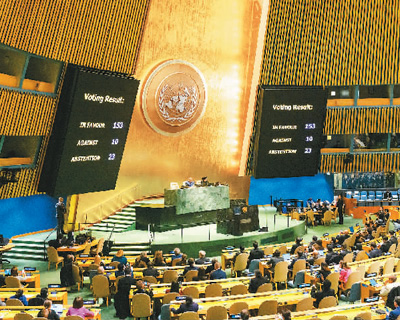 2023年12月12日,聯(lián)合國(guó)大會(huì)緊急特別會(huì)議投票通過(guò)決議,要求在加沙地帶立即實(shí)現(xiàn)人道主義?;稹D為會(huì)議投票現(xiàn)場(chǎng)。