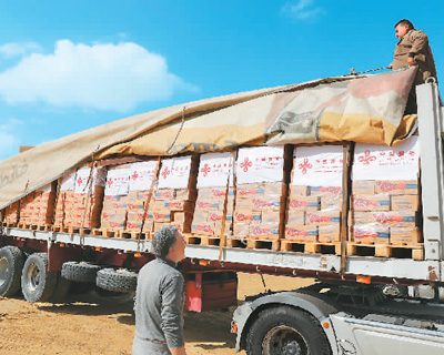 2023年11月27日,在埃及開(kāi)羅,中國(guó)向加沙地帶提供的人道主義物資裝車等待發(fā)運(yùn)。