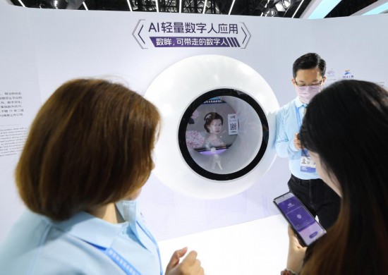 2023年11月23日,參觀者在第二屆全球數(shù)字貿(mào)易博覽會上體驗(yàn)數(shù)字人應(yīng)用。新華社記者徐昱攝
