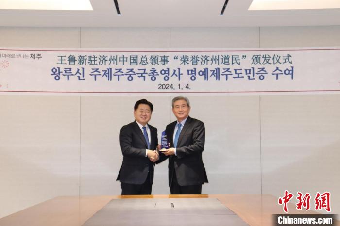 1月4日,韓國濟(jì)州道知事吳憐勛(左)向中國駐濟(jì)州總領(lǐng)事王魯新頒授“榮譽(yù)濟(jì)州道民”證書。(中國駐濟(jì)州總領(lǐng)事館供圖)