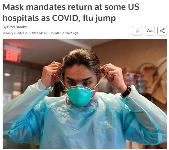 中新網1月4日電 據(jù)路透社當?shù)貢r間3日報道,由于新冠病毒和季節(jié)性流感等呼吸道疾病病例激增,美國至少有四個州的醫(yī)院重啟“口罩令”。紐約州、加利福尼亞州、伊利諾伊州和馬薩諸塞州的醫(yī)療衛(wèi)生機構恢復要求醫(yī)護人員和病患戴口罩的規(guī)定。