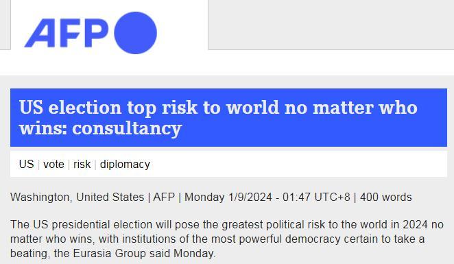 中新網(wǎng)1月10日電 據(jù)法新社報(bào)道,日前,政治風(fēng)險(xiǎn)咨詢公司歐亞集團(tuán)表示,無論誰獲勝,2024年美國總統(tǒng)選舉都將給世界帶來最大政治風(fēng)險(xiǎn),美國制度將會受到打擊。