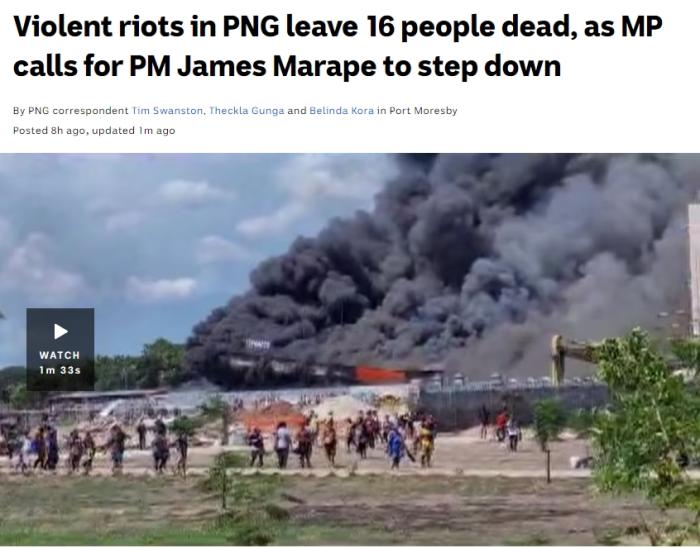 報道稱,當(dāng)天晚間,數(shù)以千計的示威者涌上街頭,巴布亞新幾內(nèi)亞首都莫爾斯比港的商店和企業(yè)被縱火或洗劫,現(xiàn)場一片騷亂。