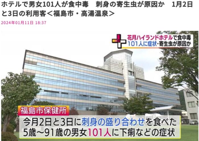 報(bào)道稱,中毒者年齡下至5歲,上至91歲。保健所在調(diào)查中發(fā)現(xiàn)該酒店提供的魚類刺身上檢測出寄生蟲,并認(rèn)為這就是導(dǎo)致此次食物中毒的原因。