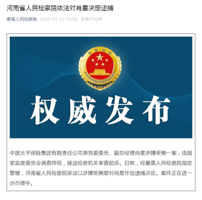 中新網1月12日電 據最高人民檢察院微信公眾號消息,中國太平保險集團有限責任公司原黨委委員、副總經理肖星涉嫌受賄一案,由國家監(jiān)察委員會調查終結,移送檢察機關審查起訴。日前,經最高人民檢察院指定管轄,河南省人民檢察院依法以涉嫌受賄罪對肖星作出逮捕決定。案件正在進一步辦理中。