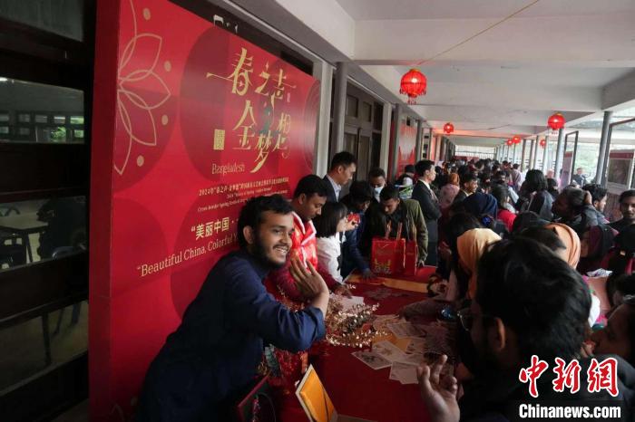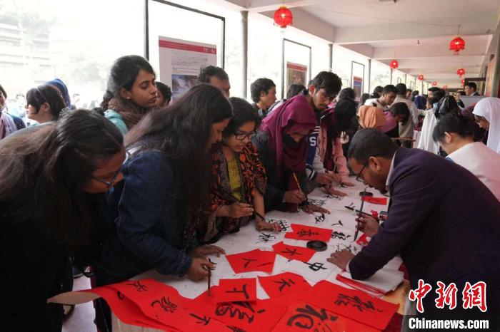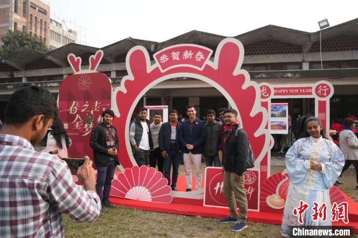 此次活動,受到達卡大學師生及當?shù)孛癖姷臍g迎。數(shù)百份“?!弊?、春聯(lián)、年畫、中國結、燈籠,營造濃濃的節(jié)日氛圍;近3000人次學生體驗寫福字、穿漢服等傳統(tǒng)文化;精彩的舞獅表演贏得陣陣喝彩;“恭賀新春”打卡區(qū)更是排起長龍……