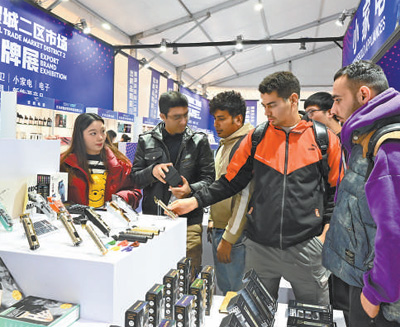在義烏國際商貿城,外國客商在二區(qū)垂直展采購小家電。
