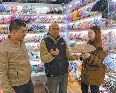 在義烏國際商貿城,外國客商正在洽談業(yè)務。