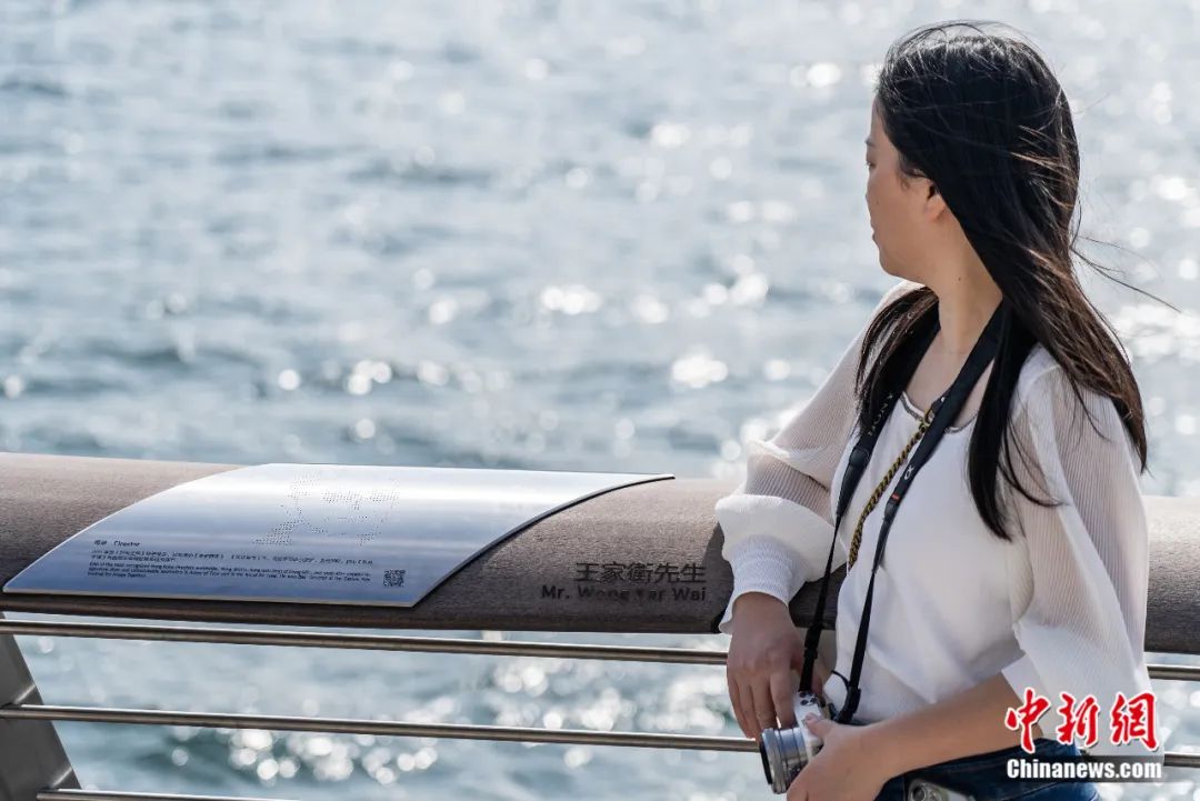 2024年1月14日,隨著電視劇《繁花》的熱播,香港尖沙咀星光大道上導(dǎo)演王家衛(wèi)的銘牌受到關(guān)注,成為游客打卡對象。侯宇 攝