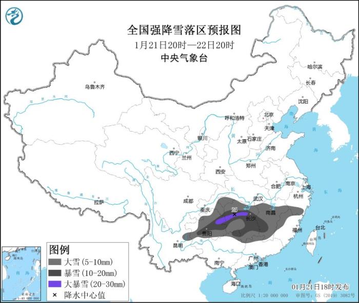 預(yù)計(jì)1月21日20時(shí)至1月22日20時(shí),重慶東部、湖北西南部、貴州、湖南、江西、福建西部和北部、浙江南部、廣西北部、廣東北部等地的部分地區(qū)有大到暴雪,其中,貴州東部、湖南中西部等地局地有大暴雪(20~25毫米),上述部分地區(qū)新增積雪深度3~10厘米,局地可達(dá)15厘米以上。貴州東南部、湖南西南部、廣西北部、廣東北部等地局地有凍雨。