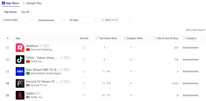 這些出海短劇雖“土”,卻在2023年國產(chǎn)應(yīng)用軟件賽道闖出一片天。據(jù)AppGrowing統(tǒng)計,ReelShort已經(jīng)成為全球短劇市場的頂級產(chǎn)品,其母公司股價持續(xù)上漲。