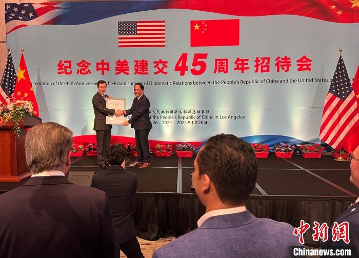 當(dāng)?shù)貢r間1月26日,中國駐洛杉磯總領(lǐng)事館舉辦紀念中美建交45周年招待會?!≈行律缬浾?張朔 攝