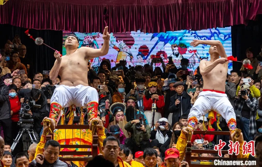 “僮身”表演者在莆禧古城“上刀梯”祈福。中新社記者 王東明 攝