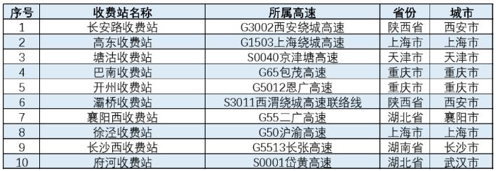 春節(jié)期間,全國高速公路預計易發(fā)生擁堵緩行的收費站,如下表所示。
