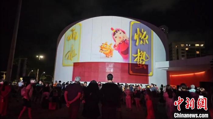 當天晚上,多娜·琳杜公園內劇院的外墻,投影出中國文化元素燈光秀。畫面中,十二個生肖福娃次第給觀眾拜年,中國傳統(tǒng)時令節(jié)氣習俗一一展演,格外吸睛。