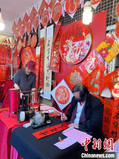 2月4日正逢立春,臺北迪化街上的商家正在書寫龍年春聯(lián)。中新社記者 路梅 攝