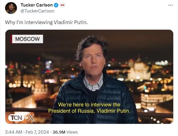 據(jù)介紹,卡爾森是??怂闺娨暸_(tái)的一名當(dāng)紅主播,主要負(fù)責(zé)一檔名為《卡爾森今夜秀》的新聞節(jié)目。他在2023年4月被??怂菇夤?,隨后在社交平臺(tái)X上繼續(xù)發(fā)布采訪節(jié)目。路透社稱,卡爾森2023年8月在X上發(fā)布的對美國前總統(tǒng)特朗普的采訪獲得了上億播放量。