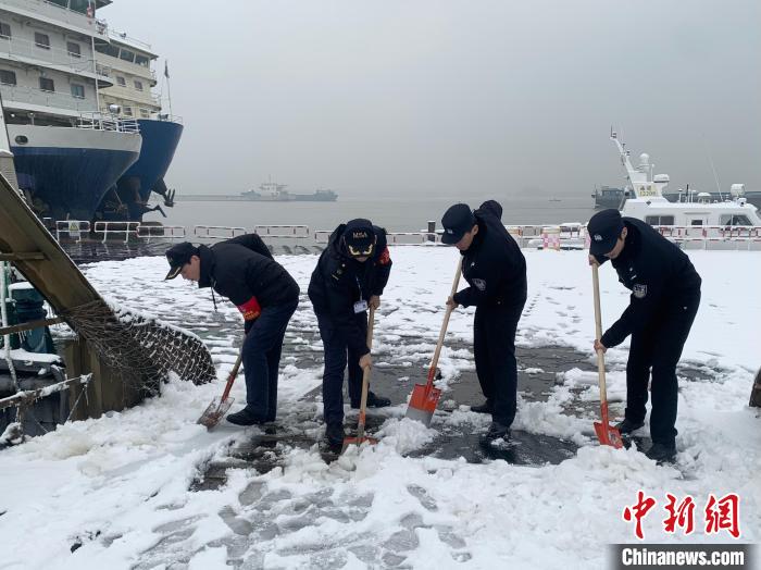 長(zhǎng)江海事人員正在鏟冰除雪。長(zhǎng)江海事局供圖