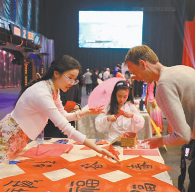 “龍”“?!薄按骸薄跁艏堈古_上,一幅幅書法作品傳遞著節(jié)慶的氛圍。當(dāng)?shù)鼐用窭獱柲闷鹨粡垺案!弊郑蚬ぷ魅藛T詢問寓意。拉莫爾就職的企業(yè)與中國有頻繁的業(yè)務(wù)往來,他曾兩次到訪中國。他說:“中國文化博大精深,中國人有著強(qiáng)烈的文化認(rèn)同感。希望多多舉辦這樣的活動,讓更多人了解中國文化?!?/p>