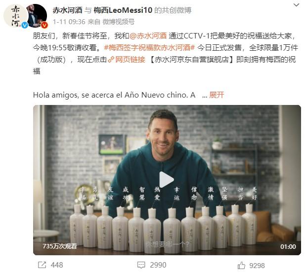 1月11日,梅西發(fā)博官宣牽手赤水河酒。梅西個人微博發(fā)文稱,梅西簽字祝福款赤水河酒當(dāng)日正式發(fā)售,全球限量1萬件,并配上了一段梅西為酒瓶一一簽名的宣傳視頻。