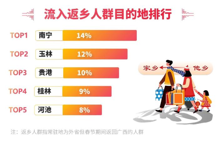 春節(jié)期間,廣西迎來(lái)客流高峰。據(jù)統(tǒng)計(jì),廣西流入客流同比增長(zhǎng)7%,流出客流同比增長(zhǎng)18%,凈增客流超過(guò)1000萬(wàn)人。其中,返桂人潮占比25%,男性成為返鄉(xiāng)主力,占比58%?!?0后”和“90后”人群成為返鄉(xiāng)主流,占比超過(guò)50%。交通出行方面,短途游備受青睞,200-500公里出行占比達(dá)到48%,汽車成為首選出行方式。