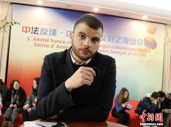 法國人民援助會全國委員會委員、本次青年代表團團長朱利安·維蘭(Julien Villain)接受中新網記者采訪。中新網黃方 攝