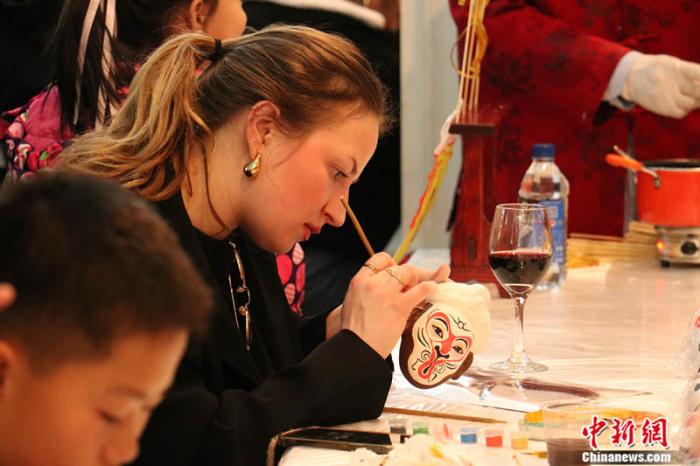 法國青年在迷你廟會活動繪制臉譜。中新網黃方 攝