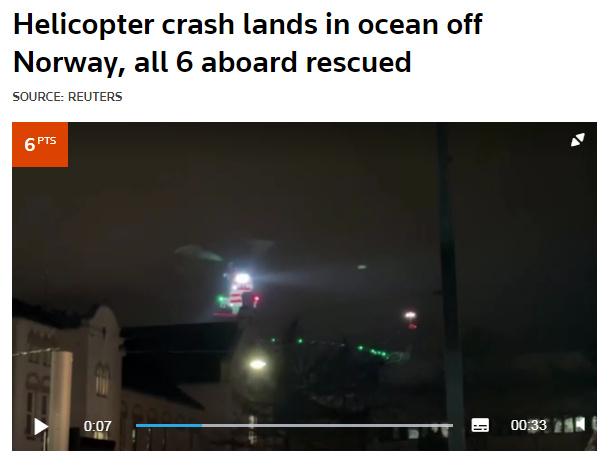 中新網(wǎng)2月29日電 據(jù)路透社報(bào)道,當(dāng)?shù)貢r間28日,挪威聯(lián)合救援協(xié)調(diào)中心稱,一架載有6人的直升機(jī)在挪威西部海岸附近海域墜毀,機(jī)上所有人員隨后被從海中救起。