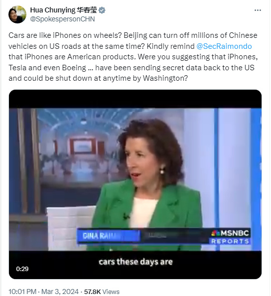 3月3日,華春瑩在社交媒體上發(fā)文回應美方這番言論,“汽車就像是裝了輪子的iPhone(蘋果手機)?北京能讓美國道路上的數(shù)百萬中國汽車同時熄火?友好提醒一下,iPhone是美國產品。你是不是在暗示iPhone、特斯拉甚至波音……一直在將機密數(shù)據傳送回美國,隨時可能被華盛頓關停?”