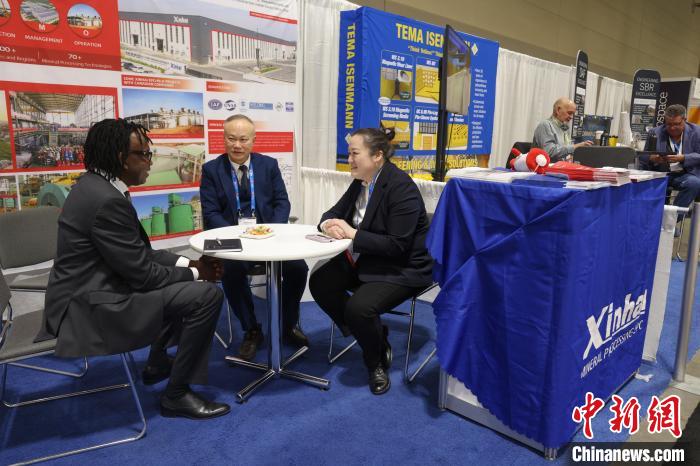 當(dāng)?shù)貢r(shí)間3月3日,2024年加拿大國(guó)際礦業(yè)大會(huì)(PDAC)在多倫多揭幕。圖為中國(guó)企業(yè)山東鑫海礦業(yè)技術(shù)裝備股份有限公司參展代表與客商洽談。中新社記者 余瑞冬 攝