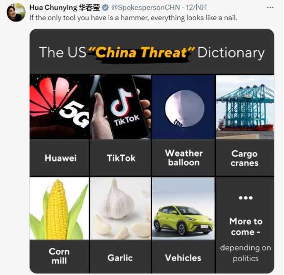 華春瑩最后回?fù)簦叭绻阄ㄒ坏墓ぞ呤清N子,那么所有東西看起來(lái)都像釘子?!边@條帖文隨附圖片上,列出美國(guó)以往炒作“中國(guó)威脅”的詞典:包括華為,TikTok,氣象無(wú)人飛艇,起重機(jī),玉米加工廠,大蒜,汽車……還有更多,取決于政治因素?!?/p>