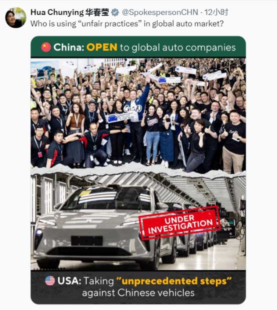 她隨后發(fā)表圖文,對(duì)比中美在汽車行業(yè)的行為問(wèn)道,“是誰(shuí)在全球汽車市場(chǎng)采取‘不公平做法’?”圖片顯示,中國(guó)的做法是“向全球車企”開放,而美國(guó)正針對(duì)中國(guó)汽車采取“前所未有的措施”?!?/p>