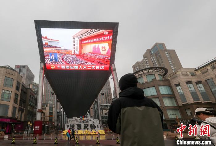 3月5日,十四屆全國(guó)人大二次會(huì)議在北京人民大會(huì)堂開(kāi)幕。圖為北京一戶外大屏播放開(kāi)幕會(huì)。 中新社記者 賈天勇 攝
