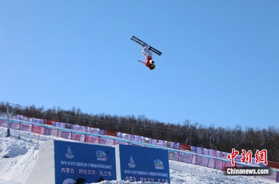“十四冬 ”自由式滑雪空中技巧公開(kāi)組女子個(gè)人比賽中,徐夢(mèng)桃在空中翻飛。 韓冷 攝