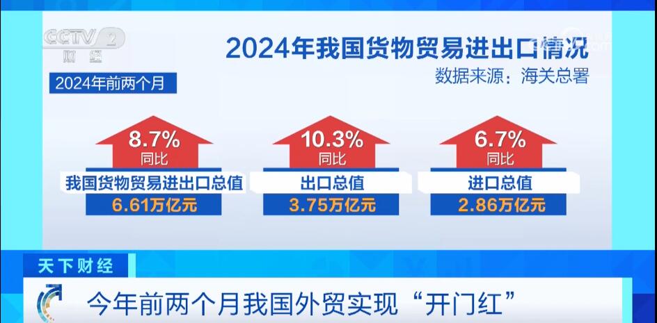 央視網(wǎng)消息:海關總署3月7日發(fā)布,今年前2個月,我國貨物貿易進出口同比增長8.7%,出口更是達到兩位數(shù)增長,外貿實現(xiàn)“開門紅”。