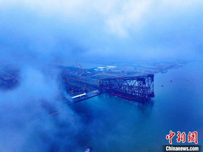 3月12日,亞洲第一深水導管架“?;枴痹趶V東珠海建造完工。這是“?;枴睂Ч芗苎b船后全景。(中國海油供圖)