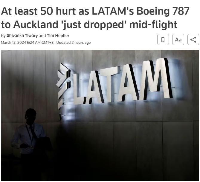 當(dāng)時, 總部位于智利的拉塔姆航空公司一架從澳大利亞悉尼飛往新西蘭奧克蘭的波音飛機,因技術(shù)問題,在飛行途中急降,“劇烈俯沖”數(shù)秒,導(dǎo)致乘客撞上機艙頂,造成至少50人受傷。