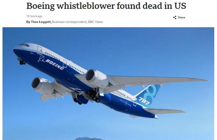 據(jù)BBC最新消息,這名曝光波音質(zhì)量亂象的“吹哨人”,于2024年3月9日被發(fā)現(xiàn)在美國一家酒店停車場內(nèi)身亡,事件正在調(diào)查中。